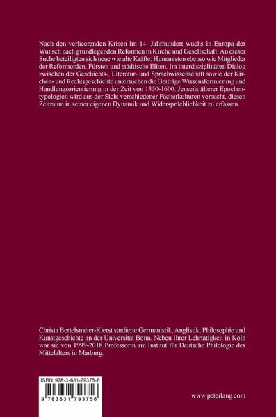 Nach den verheerenden Krisen im 14. Jahrhundert wuchs in Europa der Wunsch nach grundlegenden Reformen in Kirche und Gesellschaft. An dieser Suche beteiligten sich neue wie alte Kräfte: Humanisten ebenso wie Mitglieder der Reformorden, Fürsten und städtische Eliten. Im interdisziplinären Dialog zwischen der Geschichts-, Literatur- und Sprachwissenschaft sowie der Kirchen- und Rechtsgeschichte untersuchen die Beiträge Wissensformierung und Handlungsorientierung in der Zeit von 1350-1600. Jenseits älterer Epochentypologien wird aus der Sicht verschiedener Fächerkulturen versucht, diesen Zeitraum in seiner eigenen Dynamik und Widersprüchlichkeit zu erfassen.