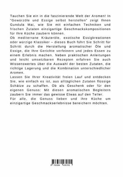 Tauchen Sie ein in die faszinierende Welt der Aromen! In "Gewürzöle und Essige selbst herstellen" zeigt Ihnen Gundula Mai, wie Sie mit einfachen Techniken und frischen Zutaten einzigartige Geschmackskompositionen für Ihre Küche zaubern können.Ob mediterrane Kräuteröle, exotische Essigkreationen oder würzige Klassiker - dieses Buch führt Sie Schritt für Schritt durch die Herstellung aromatischer Öle und Essige, die Ihre Gerichte verfeinern und jedes Essen zu einem Erlebnis machen. Neben praktischen Anleitungen und leicht umsetzbaren Rezepten erfahren Sie auch Wissenswertes über die Auswahl der besten Zutaten, die richtige Lagerung und die Kombination unterschiedlicher Aromen.Lassen Sie Ihrer Kreativität freien Lauf und entdecken Sie, wie einfach es ist, aus alltäglichen Zutaten flüssige Schätze zu schaffen. Ob als Geschenk oder für den eigenen Genuss: Mit diesen aromatischen Begleitern zaubern Sie immer das gewisse Etwas auf den Teller.Für alle, die Genuss lieben und ihre Küche umeinzigartige Geschmackserlebnisse bereichern möchten.