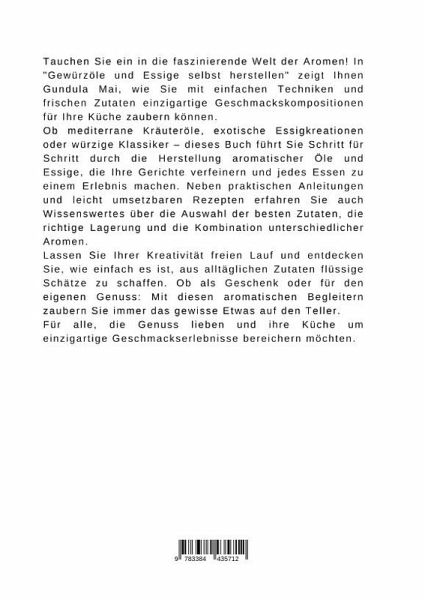 Tauchen Sie ein in die faszinierende Welt der Aromen! In "Gewürzöle und Essige selbst herstellen" zeigt Ihnen Gundula Mai, wie Sie mit einfachen Techniken und frischen Zutaten einzigartige Geschmackskompositionen für Ihre Küche zaubern können.Ob mediterrane Kräuteröle, exotische Essigkreationen oder würzige Klassiker - dieses Buch führt Sie Schritt für Schritt durch die Herstellung aromatischer Öle und Essige, die Ihre Gerichte verfeinern und jedes Essen zu einem Erlebnis machen. Neben praktischen Anleitungen und leicht umsetzbaren Rezepten erfahren Sie auch Wissenswertes über die Auswahl der besten Zutaten, die richtige Lagerung und die Kombination unterschiedlicher Aromen.Lassen Sie Ihrer Kreativität freien Lauf und entdecken Sie, wie einfach es ist, aus alltäglichen Zutaten flüssige Schätze zu schaffen. Ob als Geschenk oder für den eigenen Genuss: Mit diesen aromatischen Begleitern zaubern Sie immer das gewisse Etwas auf den Teller.Für alle, die Genuss lieben und ihre Küche umeinzigartige Geschmackserlebnisse bereichern möchten.