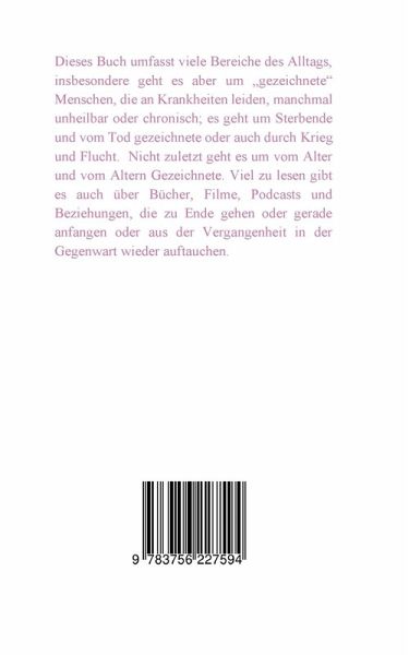 Es geht um gezeichnete Menschen, die an Krankheiten leiden, manchmal unheilbar oder chronisch; es geht um Sterbende und vom Tod gezeichnete oder auch durch Krieg und Flucht. Nicht zuletzt geht es um vom Alter und vom Altern gezeichnete. viel zu lesen gibt es auch über Bücher, filme, Podcasts und Beziehungen, die zu Ende gehen oder gerade anfangen oder aus der Vergangenheit in der Gegenwart wieder auftauchen.