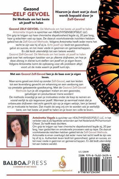 antoinetta Vogels werd in 1946, in Nederland geboren, vlak na de Tweede Wereldoorlog. Ze herinnert zich nog levendig de verhalen van haar vader over de verschrikkingen van de oorlog, terwijl ze met hem door de ruïnes van zijn geboortestad, Groningen, wandelde. Dat was het moment waarop ze zich heilig voornam, zelfs toen ze nog maar een jong meisje was, dat ze iets moest doen om mee te helpen oorlogen te voorkomen. Toen wist Antoinetta nog niet dat het leven haar een kans zou bieden een bijdrage te leveren aan een beter begrip van het menselijk gedrag, door haar op te laten groeien met een Gebrek aan Zelf- Gevoel, wat haar met de taak belastte om uit te zoeken wat er in haar leven 'ontbrak'. Antoinetta was gedurende zo'n 20 jaar werkzaam als fagottiste in verschillende Nederlandse symfonieorkesten. Het moederschap resulteerde voor haar in twee lieve dochters maar ook in een plot- selinge, ernstige slapeloosheid, waardoor ze haar muzikale carrière ontijdig achter zich moest laten. Hier begon haar innerlijke reis die inzicht moest verschaffen in de diepere oorzaak van de hachelijke situatie die haar meer dan vijfentwintig jaar bleef kwellen: slapeloos- heid. Antoinetta begon met voortdurende introspectie. Vervolgens zette zij haar gedachten en gevoelens, zo gauw die opkwamen, onmiddel- lijk op een bandje en later op de voice-recorder van haar telefoon. Dit proces stelde haar in staat om haar gedragspatronen te analyse- ren, wat uiteindelijk leidde tot haar Zelf-Gevoel Theorie. Deze theo- rie werd later omgewerkt tot de voor iedereen bruikbare Zelf-Gevoel Methode. Antoinetta's missie is het om mensen zich ervan bewust te laten worden hoe belangrijk een adequate ontwikkeling van een Gezond Zelf-Gevoel is voor hen zelf, voor hun kinderen en voor de wereld in het algemeen (Vrede)! Antoinetta woonde tot 1991 in haar thuisland, waarna ze met haar familie verhuisde, eerst naar Portugal en later naar de Verenigde Staten. Zij woont nu al vele jaren in Bellevue WA, van waaruit ze haar bedrijf Gezond Zelf-Gevoel, een franchise van Healthy Sense of Self, alsmede de Italiaanse franchise Sano Senso di Sé, beheert. Een Gezond Zelf-Gevoel is de ruggengraat van de menselijke psyche. Als je 't niet hebt, loop je je eigen leven volkomen mis!