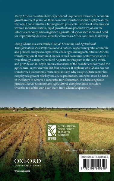 Many African countries have experienced unprecedented rates of economic growth in recent years, yet their economic transformations display features that could constrain their future growth prospects. Patterns of urbanization without industrialization, rapid growth of low productivity jobs in the informal economy, and a neglected agricultural sector with increased need for important foods are all areas for concern as Africa continues to develop. Using Ghana as a case study, Ghana's Economic and Agricultural Transformation: Past Performance and Future Prospects integrates economic and political analysis to explore the challenges and opportunities of Africa's transformation. It examines Ghana's overall economic performance since it went through a major Structural Adjustment Program in the early 1980s, and provides an in-depth empirical analysis of the broader economy and the agricultural sector over the last four decades. It explains why Ghana has not transformed its economy more substantially, why its agriculture sector has not played a greater role beyond cocoa production, and what must be done in the future to achieve a successful transformation. In addressing these puzzles Ghana's Economic and Agricultural Transformation considers what the rest of the world can learn from Ghana's experience.