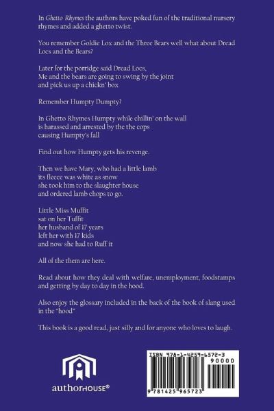 In Ghetto Rhymes the authors have poked fun of the traditional nursery rhymes and added a ghetto twist. You remember Goldie Lox and the Three Bears well what about Dread Locs and the Bears? Later for the porridge said Dread Locs, Me and the bears are going to swing by the joint and pick us up a chickn' box Remember Humpty Dumpty? In Ghetto Rhymes Humpty while chillin' on the wall is harassed and arrested by the the cops causing Humpty's fall Find out how Humpty gets his revenge. Then we have Mary, who had a little lamb its fleece was white as snow she took him to the slaughter house and ordered lamb chops to go. Little Miss Muffit sat on her Tuffit her husband of 17 years left her with 17 kids and now she had to Ruff it All of the them are here. Read about how they deal with welfare, unemployment, foodstamps and getting by day to day in the hood. Also enjoy the glossary included in the back of the book of slang used in the "hood" This book is a good read, just silly and for anyone who loves to laugh.