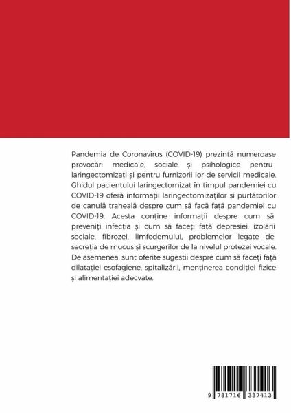 Pandemia de Coronavirus (COVID-19) prezint¿ numeroase provoc¿ri medicale, sociale ¿i psihologice pentru laringectomizäi ¿i pentru furnizorii lor de servicii medicale. Ghidul pacientului laringectomizat în timpul pandemiei cu COVID-19 ofer¿ informäii laringectomizäilor ¿i purt¿torilor de canul¿ traheal¿ despre cum s¿ fac¿ fä¿ pandemiei cu COVID-19. Acesta con¿ine informäii despre cum s¿ preveni¿i infec¿ia ¿i cum s¿ face¿i fä¿ depresiei, izol¿rii sociale, fibrozei, limfedemului, problemelor legate de secre¿ia de mucus ¿i scurgerilor de la nivelul protezei vocale. De asemenea, sunt oferite sugestii despre cum s¿ face¿i fä¿ dilatäiei esofagiene, spitaliz¿rii, men¿inerea condi¿iei fizice ¿i alimentäiei adecvate. The corona (COVID-19) pandemic presents many medical, social and psychological challenges for laryngectomees and their medical providers. The Laryngectomee Guide for COVID -19 provides information for laryngectomee and neck breathers how to cope with the COVID -19 pandemic. It contains information how to prevent the infection and deal with depression, social isolation, fibrosis, lymphedema, mucous problems, and voice prosthesis leak. It provides suggestions how to deal with esophageal dilation, hospitalization, and keep fit and eat well.
