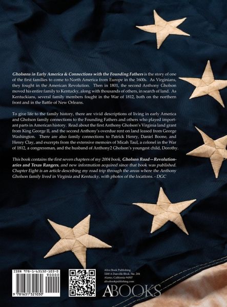 Gholsons in Early America and Their Connections with the Founding Fathers is the fifth entry in Donna Gholson Cook's well- documented family history series. Her passion for researching Gholson family history has led to amazing discoveries like a letter from George Washington to his brother discussing how to handle Anthony Gholson's late payment of his rent. Donna's husband, Lewis, quipped that she is eligible for the D.A.R.-Deadbeats of the American Revolution! Read the stirring stories of family involvement in the Battle of New Orleans and connections to such diverse historical figures as Pocahontas, Patrick Henry, and others. This book is not only for thousands of Gholson descendants scattered around the United States and the world, but for anyone interested in learning more about everyday life in the early days of our nation.
