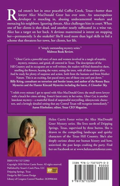 Lawyer Helen Currie Foster, fascinated by Texas hill country, lives and writes north of Dripping Springs, supervised by three burros. She's fascinated by "dirt and water" law, and active with Austin Shakespeare, Heart of Texas Sisters in Crime, and Hays County Master Naturalist events. Each of her Alice MacDonald Greer mystery novels (Ghost Cave, Ghost Dog, Ghost Letter, Ghost Dagger, Ghost Next Door, Ghost Cat, Ghost Daughter, and now Ghost Bones) includes "Ghost" in the title because of an old sin, old love, or old death...leading to a new murder. Ghost Cat won "Semifinalist" for Mystery in the 2020 Next Generation Indie Book Awards. Kirkus Reviews says of Ghost Daughter, "An appealing character headlines a solid thriller with panache." Ghost Daughter received First Runnerup, Mystery/Crime, in the 2022 Eric Hoffer Book Award, and won 2022 National Indie Excellence Award, Finalist, Mystery. Find Helen's books on Amazon, IngramSpark, Audible, and at BookPeople and other independent bookstores. Follow Helen on www.helencurriefoster.com and https://www.facebook.com/helencurriefoster.