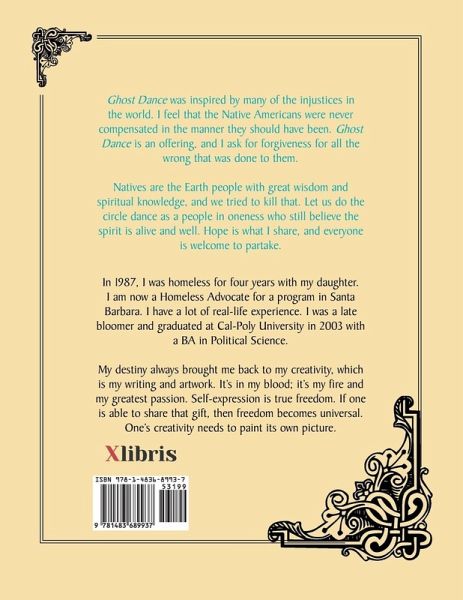 Ghost Dance was inspired my many of the injustices in the world. I feel that the Native Americans were never compensated in the manner they should have been. Ghost Dance is an offering, and I ask for forgiveness for all the wrong that was done to them. Native are the Earth people with great wisdom and spiritual knowledge, and we tried to kill that. Let us do the circle dance as a people in oneness who still believe the spirit is alive and well. Hope is what I share, and everyone is welcome to partake.