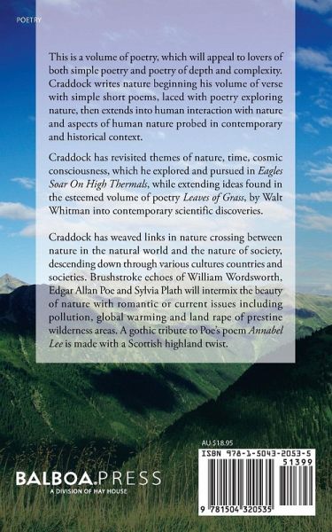 This is a volume of poetry which will appeal to lovers of both simple poetry and poetry of depth and complexity. Craddock writes nature beginning his volume of verse with simple short poems, laced with poetry exploring nature, then extends into human interaction with nature and aspects of human nature probed in contemporary and historical context. Craddock has revisited themes of nature, time, cosmic consciousness, which he explores and pursed in Eagles Soar On High Thermals, while extending ideas found in the esteemed volume of poetry, Leaves of Grass, by Walt Witman into contempory scientific discoveries. Craddock has weaved links in nature crossing between nature and the natural world and the nature of society, descending down through various cultures countries and societies. Brushstroke echoes of William Wordsworth, Edgar Allan Poe and Sylvia Plath will intermix the beauty of nature with romantic or current issues including pollution, global warming and land rape of prestine wilderness areas. A gothic tribute to Poe's poem annabel Lee is made with a Scottish highland twist. A must read for inquisitive minds desiring to pursue poetic expression, thoughs engaging with insights into enduring mysteries of life and nature.