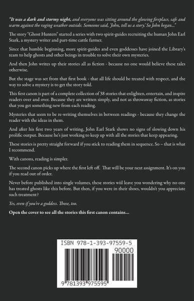 "It was a dark and stormy night, and everyone was sitting around the glowing fireplace, safe and warm against the raging weather outside. Someone said, 'John, tell us a story.' So John began..." The story "Ghost Hunters" started a series with two spirit-guides recruiting the human John Earl Stark, a mystery writer and part-time cattle farmer. Since that humble beginning, more spirit-guides and even goddesses have joined the Library's team to help ghosts and other beings in trouble to solve their own mysteries. And then John writes up their stories all as fiction - because no one would believe these tales otherwise. But the stage was set from that first book - that all life should be treated with respect, and the way to solve a mystery is to get the story told. This first canon is part of a complete collection of 38 stories that enlighten, entertain, and inspire readers over and over. Because they are written simply, and not as throwaway fiction, as stories that you get something new from each reading. Mysteries that seem to be re-writing themselves in between readings - because they change the reader with the ideas in them. And after his first two years of writing, John Earl Stark shows no signs of slowing down his prolific output. Because he's just working to keep up with all the stories that keep appearing. These stories is pretty straight forward if you stick to reading them in sequence. So - that is what I recommend. With canons, reading is simpler. The second canon picks up where the first left off. That will be your next assignment. It's on you if you read out of order. Never before published into single volumes, these stories wiil leave you wondering why no one has treated ghosts like this before. But then, if you were in their shoes, wouldn't you appreciate such treatment? Yes, even if you're a goddess. Those, too. Open the cover to see all the stories this first canon contains...