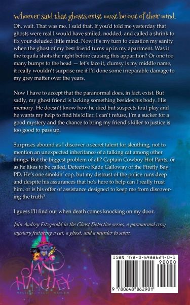 Whoever said that ghosts exist must be out of their mind. Oh, wait. That was me. I said that. If you'd told me yesterday that ghosts were real I would have smiled, nodded, and called a shrink to fix your deluded little mind. Now it's my turn to question my sanity when the ghost of my best friend turns up in my apartment. Was it the tequila shots the night before causing this apparition? Or one too many bumps to the head - let's face it, clumsy is my middle name, it really wouldn't surprise me if I'd done some irreparable damage to my grey matter over the years. Now I have to accept that the paranormal does, in fact, exist. But sadly, my ghost friend is lacking something besides his body. His memory. He doesn't know how he died but suspects foul play and he wants my help to find his killer. I can't refuse, I'm a sucker for a good mystery and the chance to bring my friends killer to justice is too good to pass up. Surprises abound as I discover a secret talent for sleuthing, not to mention an unexpected inheritance of a talking cat among other things. But the biggest problem of all? Captain Cowboy Hot Pants, or as he likes to be called, Detective Kade Galloway of the Firefly Bay PD. He's one smokin' cop, but my distrust of the police runs deep and despite his assurances that he's here to help can I really trust him, or is his offer of assistance designed to keep me from discovering the truth? I guess I'll find out when death comes knocking on my door. Join Audrey Fitzgerald in the Ghost Detective series, a paranormal cozy mystery featuring a cat, a ghost, and a murder to solve.