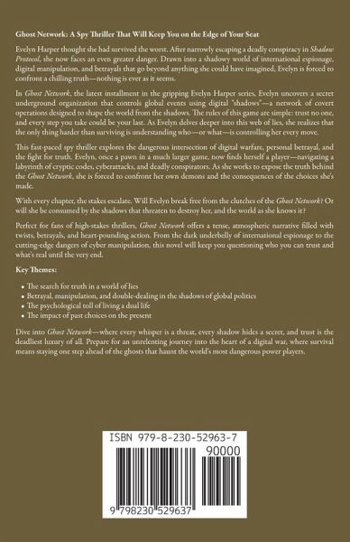Ghost Network: A Spy Thriller That Will Keep You on the Edge of Your Seat Evelyn Harper thought she had survived the worst. After narrowly escaping a deadly conspiracy in Shadow Protocol, she now faces an even greater danger. Drawn into a shadowy world of international espionage, digital manipulation, and betrayals that go beyond anything she could have imagined, Evelyn is forced to confront a chilling truth-nothing is ever as it seems. In Ghost Network, the latest installment in the gripping Evelyn Harper series, Evelyn uncovers a secret underground organization that controls global events using digital "shadows"-a network of covert operations designed to shape the world from the shadows. The rules of this game are simple: trust no one, and every step you take could be your last. As Evelyn delves deeper into this web of lies, she realizes that the only thing harder than surviving is understanding who-or what-is controlling her every move. This fast-paced spy thriller explores the dangerous intersection of digital warfare, personal betrayal, and the fight for truth. Evelyn, once a pawn in a much larger game, now finds herself a player-navigating a labyrinth of cryptic codes, cyberattacks, and deadly conspirators. As she works to expose the truth behind the Ghost Network, she is forced to confront her own demons and the consequences of the choices she's made. With every chapter, the stakes escalate. Will Evelyn break free from the clutches of the Ghost Network? Or will she be consumed by the shadows that threaten to destroy her, and the world as she knows it? Perfect for fans of high-stakes thrillers, Ghost Network offers a tense, atmospheric narrative filled with twists, betrayals, and heart-pounding action. From the dark underbelly of international espionage to the cutting-edge dangers of cyber manipulation, this novel will keep you questioning who you can trust and what's real until the very end. Key Themes:The search for truth in a world of lies Betrayal, manipulation, and double-dealing in the shadows of global politics The psychological toll of living a dual life The impact of past choices on the present Dive into Ghost Network-where every whisper is a threat, every shadow hides a secret, and trust is the deadliest luxury of all. Prepare for an unrelenting journey into the heart of a digital war, where survival means staying one step ahead of the ghosts that haunt the world's most dangerous power players.