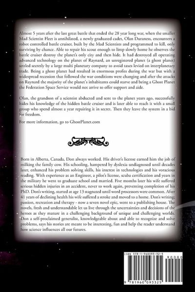 Almost 5 years after the last great battle that ended the 28 year long war, when the smaller Mad Scientist Fleet is annihilated, a newly graduated cadet, Olan Duraness, encounters a robot controlled battle cruiser, built by the Mad Scientists and programmed to kill, only surviving by chance. Able to repair his scout enough to limp slowly home he observes the battle cruiser destroy the planet's only city and then hide. It had destroyed all operating advanced technology on the planet of Raynard, an unregistered planet (a ghost planet) settled secretly by a large multi planetary company to avoid taxes levied on interplanetary trade. Being a ghost planet had resulted in enormous profits during the war but with a widespread recession that followed the war conditions were changing and after the attacks on Raynard the majority of the planets inhabitants could starve and being a Ghost Planet the Federation Space Service would not arrive to offer support and aide. Olan, the grandson of a scientist abducted and sent to the planet years ago, successfully hides his knowledge of the hidden battle cruiser and is later able to reach it with a small group who spend almost a year repairing it in secret. Then they leave the system in a bid for freedom. For more information, go to GhostPlanet.com