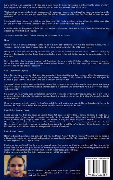 Book 1: Layla FireStar is an insurance rep by day, and a ghost reaper by night. Her passion is setting free the ghosts who have been trapped by the evils of the world. However, she has to be able to survive her life on earth. While working her day job Layla will be summoned by an unlikely source who will teach her things she never knew. She will learn who she is and where she comes from. She will set Theodosius and Alister free from their torment, and show them love. Love brought them together, but will love tear them apart? Will Layla be able to survive without her shifter mate Silas, and join forces and hearts with Theodosius and Alister? Or will she falter and be on her own? Come follow us on this journey of love, loss, sex, passion, and freedom. Enjoy the passion of these interactions as they all reap the rewards of ghost reaping. 18+/Mature Audience due to content that may not be suitable for all readers. Book 2: Harley Calix is a demon anthologist in the realm of Luxor. She's madly in love with her boyfriend Roman, who's a vampire. They live their days in Cain's Palace left to them by Layla Firestar, who's the ghost reaper. Part 1 Supernatural Agency Layla Firestar starts an agency that fights the supernatural beings that threaten her existence. When she comes upon a demonic creature that isn't from her world she has to make a choice. If she consumes him then she will upset the balance of good and evil, but if she allows him to continue he will end her. Book 3 Part 2 Killer Contract Agency Salina Sinclare was born and raised in Crystal Crest, but gains her power from a family heirloom. It looks like a fashionable piece of jewelry, but it possesses the ability to do so much more. When she's recruited from the Death Realm to run her family's legacy known as the Killer Contract Agency she proves her power is valuable. When she goes on her first case she runs into Darrel Crichton who's the evilest demon in the Angel Witch Utopia Realm. He's contracted by a leader possessed by another demon to end Layla and Harley's existence. Salina, however, runs into her rival from a past life and shows her strength with the flick of her wrist.