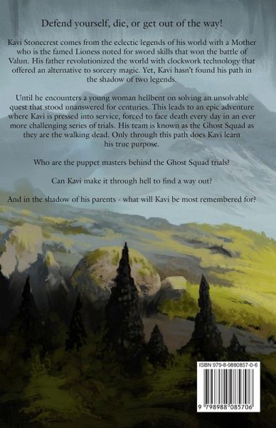 Defend yourself, die, or get out of the way! Kavi Stonecrest comes from the eclectic legends of his world with a Mother who is the famed Lioness noted for sword skills that won the battle of Valun. His father revolutionized the world with clockwork technology that offered an alternative to sorcery magic. Yet, Kavi hasn't found his path in the shadow of two legends. Until he encounters a young woman hellbent on solving an unsolvable quest that stood unanswered for centuries. This leads to an epic adventure where Kavi is pressed into service, forced to face death every day in an ever more challenging series of trials. His team is known as the Ghost Squad as they are the walking dead. Only through this path does Kavi learn his true purpose. Who are the puppet masters behind the Ghost Squad trials? Can Kavi make it through hell to find a way out? And in the shadow of his parents - what will Kavi be most remembered for? His swordsmanship, his brilliance, or something nobody expected?