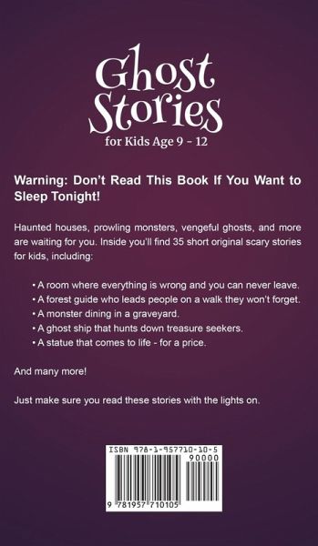 Give Your Kids a Fright! Haunted houses, prowling monsters, vengeful ghosts, and more are waiting for you. Inside you'll find 35 original short scary stories for kids, including: A room where everything is wrong and you can never leave. A forest guide who leads people on a walk they won't forget. A monster dining in a graveyard. A ghost ship that hunts down treasure seekers. A statue that comes to life - for a price. And many more! Just make sure you read these stories with the lights on.