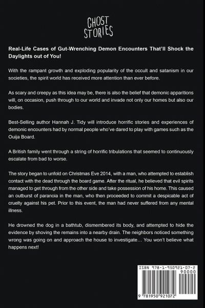 Real-Life Cases of Gut-Wrenching Demon Encounters That’ll Shock the Daylights out of You! With the rampant growth and exploding popularity of the occult and satanism in our societies, the spirit world has received more attention than ever before. As scary and creepy as this idea may be, there is also the belief that demonic apparitions will, on occasion, push through to our world and invade not only our homes but also our bodies. Best-Selling author Hannah J. Tidy will introduce horrific stories and experiences of demonic encounters had by normal people who’ve dared to play with games such as the Ouija Board. A British family went through a string of horrific tribulations that seemed to continuously escalate from bad to worse. The story began to unfold on Christmas Eve 2014, with a man, who attempted to establish contact with the dead through the board game. After the ritual, he believed that evil spirits managed to get through from the other side and take possession of his home. This caused an outburst of paranoia in the man, who then proceeded to commit a despicable act of cruelty against his pet. Prior to this event, the man had never suffered from any mental illness. He drowned the dog in a bathtub, dismembered its body, and attempted to hide the evidence by shoving the remains into a nearby drain. The neighbors noticed something wrong was going on and approach the house to investigate… You won’t believe what happens next! Read This Expanded Edition for FREE with Kindle Unlimited - Download Now! Don’t Delay -- Get your copy of Horror Stories right away. Scroll to the top and select the "BUY" button for Instant Download. You’ll be so happy you did!