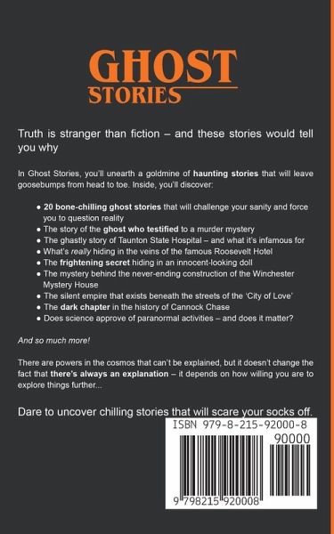 Truth is stranger than fiction - and these stories would tell you why Have you ever felt a sudden drop in temperature around you? Have you ever experienced a strange, soft voice whispering in your ears? Do you believe that there's a world beyond our tangible world - things that can only be felt and not seen? If your answer is 'yes' to any of the above questions, then you're not the only one. About 46% of Americans believe that ghosts are real, with a staggering number of them reporting to have experienced paranormal activities at some point in their lives. Ghost stories have had a special place in many cultures throughout history. They are the portal to connect with a world that resides beyond our imagination. We are drawn to supernatural stories and mysteries - they have the power to evoke curiosity and widen our perception. But the stories you're about to uncover aren't some spiritual mumbo jumbo... each one has a compelling truth attached to it supported by convincing evidence. In Ghost Stories, you'll unearth a goldmine of haunting stories that will leave goosebumps from head to toe. Inside, you'll discover:20 bone-chilling ghost stories that will challenge your sanity and force you to question reality The story of the ghost who testified to a murder mystery The ghastly story of Taunton State Hospital - and what it's infamous for What's really hiding in the veins of the famous Roosevelt Hotel The frightening secret hiding in an innocent-looking doll The mystery behind the never-ending construction of the Winchester Mystery House The silent empire that exists beneath the streets of the 'City of Love' The dark chapter in the history of Cannock Chase Does science approve of paranormal activities - and does it matter? And so much more! A horror movie or book may scare the soul out of your body, but you at least have the relief that it's all fiction. What's more terrifying is when such stories have happened in real life... and make Stephen King's stories look like lullabies. While these supernatural stories might seem fabricated, there's always some truth in them... and that's what makes them more terrifying. There are powers in the cosmos that can't be explained, but it doesn't change the fact that there's always an explanation - it depends on how willing you are to explore things further... If you dare to uncover chilling stories that will scare your socks off