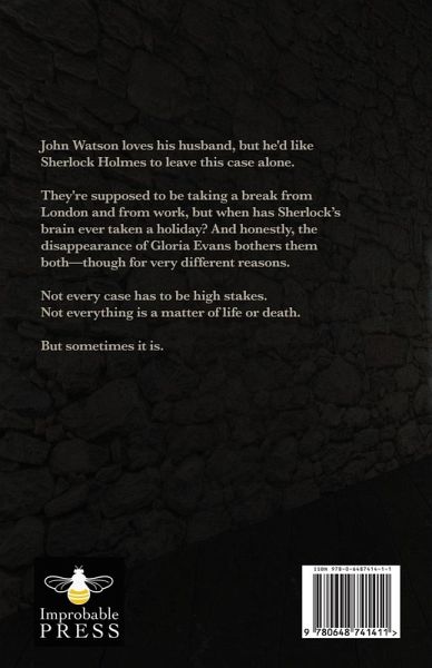 John Watson loves his husband, but he'd like Sherlock Holmes to leave this case alone. They're supposed to be taking a break from London and from work, but when has Sherlock's brain ever taken a holiday? And honestly, the disappearance of Gloria Evans bothers them both - though for very different reasons. Not every case has to be high stakes. Not everything is a matter of life or death. But sometimes it is.