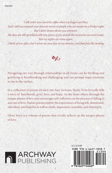 I still order your favorite coffee when my fingers are blue, And I still recommend your favorite movie to people who are lonely on a Friday night. But I don't dream about you anymore. My days are still sprinkled with tiny pieces of you and all the memories we won't make. But my nights are mine again. I think of you often, but I never see your face in my dreams, and that feels like healing. Navigating our way through relationships in all forms can be thrilling and gratifying or heartbreaking and challenging, and can prompt many emotions to rise to the surface. In a collection of poems divided into four sections, Nadia Vires lyrically tells a story of heartbreak, grief, love, and hope. As she leads others through the unique phases of love and encourages self-reflection on the process of falling in and out of love, Nadia's poems explore the experiences of being left, abandoned, cherished, and hopeful as well as death, depression, sexuality, and femininity.