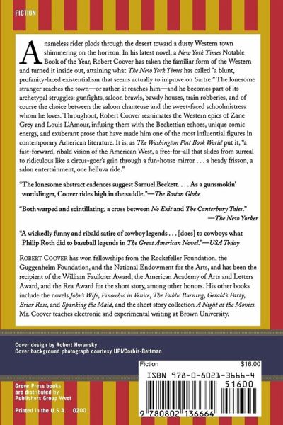A nameless rider plods through the desert toward a dusty Western town shimmering on the horizon. In his latest novel, Robert Coover has taken the familiar form of the Western and turned it inside out. The lonesome stranger reaches the town - or rather, it reaches him - and he becomes part of its gunfights, saloon brawls, bawdy houses, train robberies, and, of course, the choice between the saloon chanteuse or the sweet-faced schoolmistress whom he loves. Throughout, Robert Coover reanimates the Western epics of Zane Grey and Louis L'Amour, infusing them with the Beckettian echoes, unique comic energy, and exuberant prose that have made him one of the most influential figures in contemporary American literature. It is, as The Washington Post Book World put it, "a fast-forward, ribald vision of the American West, a free-for-all that slides from surreal to ridiculous like a circus-goer's grin through a funhouse mirror . . . a heady frisson, a salon entertainment, one helluva ride."
