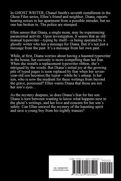 In GHOST WRITER, Chanel Smith's seventh installment in the Ghost Files series, Ellen's friend and neighbor, Diana, reports hearing noises in her apartment from a possible intruder, but no one has broken in. The police are stumped. Ellen senses that Diana, a single mom, may be experiencing paranormal activity. Upon investigation, It seems that an old manual typewriter-typing by itself-is being operated by a ghostly writer who has a message for Diana. But it's not just a message from the past. It's a message from her own past.
