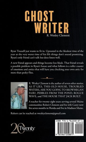 Ryan Trussell just wants to fit in. Uprooted in the bleakest time of the year at the very worst time of his life things don't sound promising. Ryan's only friend can't talk but does listen well. A new friend appears and things become less bleak. That friend reveals a possible problem in Ryan's house and what follows is a roller coaster of emotions and antics that will have you checking your own attic for more than pesky flies. R. Wesley Clement is the author of seven other stories: AS IT LIES, THIS OLD HOUSE, TROUBLED WATERS, ARE YOU GOING TO SKOWHEGAN FAIR?, PEBBLES FROM THE POND, Rogue Wave, and THE HOUSE THAT JACK BUILT. A teacher for twenty eight years serving several Maine communities Robert Clement and his wife Carey now live seven months in Florida and five in Madison Maine. Robert can be reached at rwesleyclement@gmail.com