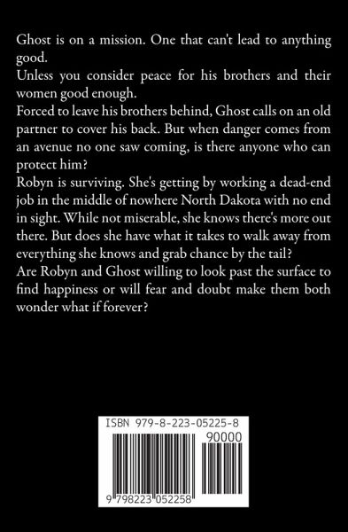Ghost is on a mission. One that can't lead to anything good. Unless you consider peace for his brothers and their women good enough. Forced to leave his brothers behind, Ghost calls on an old partner to cover his back. But when danger comes from an avenue no one saw coming, is there anyone who can protect him? Robyn is surviving. She's getting by working a dead-end job in the middle of nowhere North Dakota with no end in sight. While not miserable, she knows there's more out there. But does she have what it takes to walk away from everything she knows and grab chance by the tail? Are Robyn and Ghost willing to look past the surface to find happiness or will fear and doubt make them both wonder what if forever?