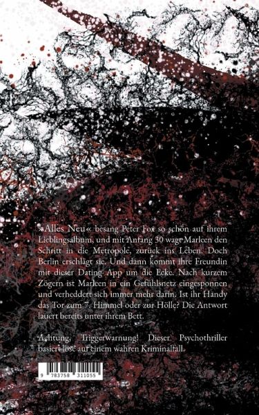 »Alles Neu« besang Peter Fox so schön auf ihrem Lieblingsalbum, und mit Anfang 30 wagt Marleen den Schritt in die Metropole, zurück ins Leben. Doch Berlin erschlägt sie. Und dann kommt ihre Freundin mit dieser Dating-App um die Ecke. Nach kurzem Zögern ist Marleen in ein Gefühlsnetz eingesponnen und verheddert sich immer mehr darin. Ist ihr Handy das Tor zum 7. Himmel oder zur Hölle? Die Antwort lauert bereits unter ihrem Bett. Achtung, Triggerwarnung! Dieser Psychothriller basiert lose auf einem wahren Kriminalfall.