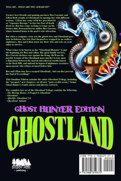 Tell me... what are you afraid of? Be first in line for the most haunted theme park in the park in the world - GHOSTLAND! Discover and explore hundreds of haunted buildings and cursed objects! Witness spectral beings of all kinds with our patented Augmented Reality glasses! Experience all the terror and thrills the afterlife has to offer, safely protected by our Recurrence Field technology! Visit Ghostland today - it's the most terrifying place on earth! ________ Former best friends and gaming partners Ben Laramie and Lilian Roth reunite at Ghostland on opening day with ulterior motives. Lilian has come with her therapist as "exposure therapy," to face her fear of death dead on. Ben has come seeking revenge on his former idol, deceased horror author Rex Garrote, whose haunted house is the park's star attraction. But when a computer virus sets the ghosts free and the park goes into lockdown, the trio find themselves trapped in an endless nightmare. Ben and Lilian must use their wits and rely on each other to survive. What comes to be known as the "Ghostland Disaster" is just the beginning for Ben and Lilian. His spirit finally set free, Rex Garrote declares war against the living. He'll use the psychic trauma of the Ghostland mass murder to tear open a dimension between the mortal and ethereal worlds known as the Dark Rift, and unleash its legion of nightmare creatures upon anyone who refuses to kneel before him. Ben and Lilian may have escaped Ghostland... but can they prevent the End of Everything? This Omnibus Edition contains the entire Ghostland Trilogy, including the "prequel," new chapters, an all-new "post-credits scene," bonus Ghost Hunter's Guide entries and interior artwork. The complete box set of the Ghostland Trilogy contains the following books: - The Moving House: A Prequel to Ghostland - Ghostland - Afterlife: Ghostland 2.0 - Ghostland: Infinite