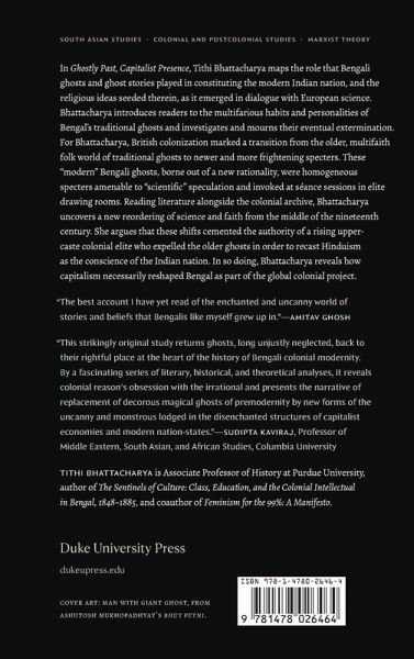 In Ghostly Past, Capitalist Presence, Tithi Bhattacharya maps the role that Bengali ghosts and ghost stories played in constituting the modern Indian nation, and the religious ideas seeded therein, as it emerged in dialogue with European science. Bhattacharya introduces readers to the multifarious habits and personalities of Bengal's traditional ghosts and investigates and mourns their eventual extermination. For Bhattacharya, British colonization marked a transition from the older, multifaith folk world of traditional ghosts to newer and more frightening specters. These "modern" Bengali ghosts, borne out of a new rationality, were homogeneous specters amenable to "scientific" speculation and invoked at séance sessions in elite drawing rooms. Reading literature alongside the colonial archive, Bhattacharya uncovers a new reordering of science and faith from the middle of the nineteenth century. She argues that these shifts cemented the authority of a rising upper-caste colonial elite who expelled the older ghosts in order to recast Hinduism as the conscience of the Indian nation. In so doing, Bhattacharya reveals how capitalism necessarily reshaped Bengal as part of the global colonial project.