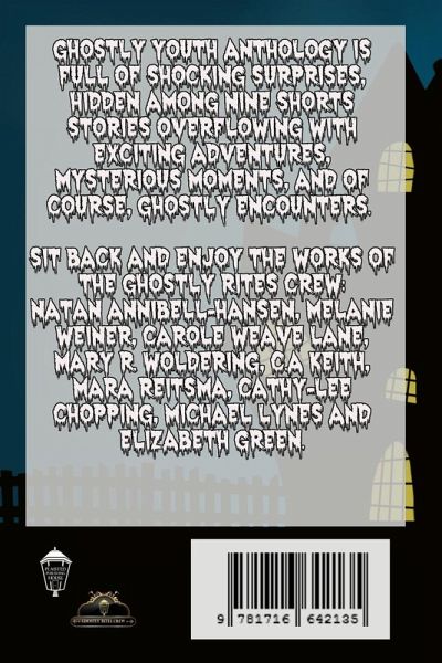 Ghostly youth Anthology is full of shocking surprises, hidden among nine short stories overflowing with exciting adventures, mysterious moments and of course, ghostly encounters. Sit back and enjoy the works of the Ghostly Rites Crew... Natan Annabell-Hansen, Melaine Weiner, Carole Weave Lane, Mary Woldering, C A Keith, Mara Reitsma, Cathy-Lee Chopping, Michael Lynes and Elizabeth Green