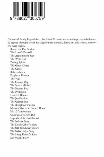 Ghosts and Family Legends is a collection of 26 horror stories and supernatural tales told by a group of people closed in a large country mansion, during one cold winter, over several scary nights. Round the Fire Stories: The Lover's Farewell The Appointment Kept The White Cat Passing Spirits The Garde Chasse The Carrier Rehearsals, etc Prophetic Dreams The Vigil The Strange Dog The Scotch Minister The Radiant Boy The Prediction Haunted Houses The Justification The German Inn The Benighted Traveller My own Visit to a Haunted House Mr. G.'s Adventure Conclusion to First Part Legends of the Earthbound: The Italian's Story The Dutch Officer's Story The Old Frenchman's Story The Swiss Lady's Story The Sheep Farmer's Story My Friend's Story