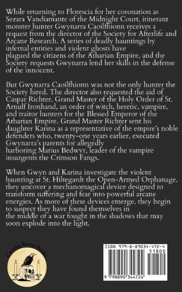 While returning to Florescia for her coronation as Sezara Vandiamante of the Midnight Court, itinerant monster hunter Gwynarra Caoilfhionn receives a request from the director of the Society for Afterlife and Arcane Research. A series of deadly hauntings by infernal entities and violent ghosts have plagued the citizens of the Atharian Empire, and the Society requests Gwynarra lend her skills in the defense of the innocent. But Gwynarra Caoilfhionn was not the only hunter the Society hired. The director also requested the aid of Caspar Richter, Grand Master of the Holy Order of St. Arnulf Ironhand, an order of witch, heretic, vampire, and traitor hunters for the Blessed Emperor of the Atharian Empire. Grand Master Richter sent his daughter Karina as a representative of the empire's noble defenders who, twenty-one years earlier, executed Gwynarra's parents for allegedly harboring Marius Bedwyr, leader of the vampire insurgents the Crimson Fangs. When Gwyn and Karina investigate the violent haunting at St. Hiltegardt the Open-Armed Orphanage, they uncover a mechanomagical device designed to transform suffering and fear into powerful arcane energies. As more of these devices emerge, they begin to suspect they have found themselves in the middle of a war fought in the shadows that may soon explode into the light.