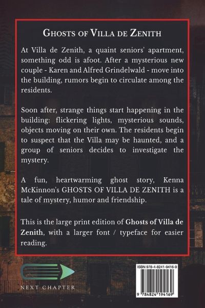 At Villa de Zenith, a quaint seniors' apartment, something odd is afoot. After a mysterious new couple - Karen and Alfred Grindelwald - move into the building, rumors begin to circulate among the residents. Soon after, strange things start happening in the building: flickering lights, mysterious sounds, objects moving on their own. The residents begin to suspect that the Villa may be haunted, and a group of seniors decides to investigate the mystery. A fun, heartwarming ghost story, Kenna McKinnon's GHOSTS OF VILLA DE ZENITH is a tale of mystery, humor and friendship. This is the large print edition of Ghosts of Villa de Zenith, with a larger font / typeface for easier reading.