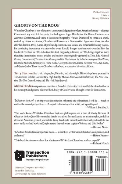 Whittaker Chambers is one of the most controversial figures in modern American history a former Communist spy who left the party, testified against Alger Hiss before the House Un-American Activities Committee, and wrote a classic autobiography, Witness. Dismissed by some as a crank, reviled by others as a traitor, Chambers still looms as a Dostoevskian figure over three decades after his death in 1961. A man of profound pessimism, rare vision, and remarkable literary talents, his continuing importance was attested to when Ronald Reagan posthumously awarded him the Medal of Freedom in 1984. Ghosts on the Roof, originally published in 1989, brings together more than fifty short stories, essays, articles, and reviews that originally appeared in Time, Life, National Review, Commonweal, The American Mercury, and the New Masses. Included are essays on Karl Marx, Reinhold Niebuhr, James Joyce, Franz Kafka, George Santayana, Dame Rebecca West, Ayn Rand, and Greta Garbo. These show Chambers at his best, as a peerless historian of ideas.
