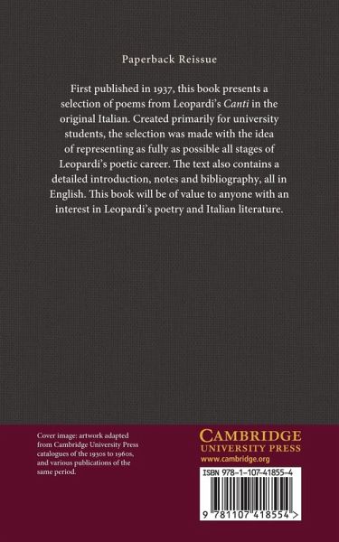 First published in 1937, this book presents a selection of poems from Leopardi's Canti in the original Italian. Created primarily for university students, the selection was made with the idea of representing as fully as possible all stages of Leopardi's poetic career. The text also contains a detailed introduction, notes and bibliography, all in English. This book will be of value to anyone with an interest in Leopardi's poetry and Italian literature.