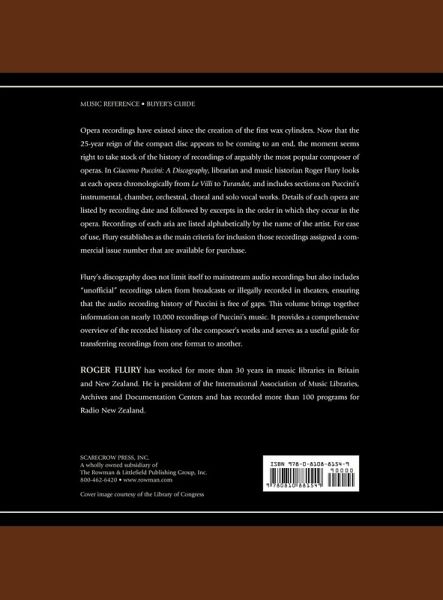 In Giacomo Puccini: A Discography, librarian and music historian Roger Flury brings together information on nearly 10,000 recordings of Giacomo Puccini's music. Flury looks at each of Puccini's operas chronologically from Le Villi to Turandot, followed by sections on Puccini's instrumental, chamber, orchestral, and solo vocal works. Details of each complete opera are listed by recording date, followed by excerpts in the order in which they occur in the opera. Recordings of each aria are listed alphabetically by the name of the artist. For ease of use, Flury establishes as the main criteria for inclusion those recordings assigned a commercial issue number and available for purchase, ensuring that this audio recording history of Puccini is free of gaps.