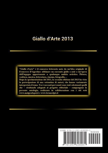 "Giallo d'arte 2013" è la seconda antologia prodotta dall'omonimo concorso letterario nato da un'idea originale di Francesco D'Agostino: abbinare un racconto giallo o noir a un'opera dell'ingegno appartenente a qualunque ambito artistico. Pittura, scultura, musica, letteratura, cinema, fotografia. Giallo d'Arte è promosso da Bruno Elpis e Malgradopoi. Il volume raccoglie 34 racconti di genere giallo, thriller e noir. Prefazione di Angelo Fàvaro, cover di Ilaria Spes. Con la partecipazione straordinaria di Patrizia Rinaldi. Ha collaborato Tullio Aragona. Sito web: www.giallodarte.it