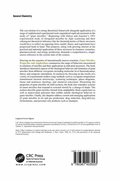Molecular Thermodynamics of Giant Micelles Molecular Packing in Cylindrical Micelles Computer Simulations of Wormlike Micelles Theoretical Rheology of Giant Micelles Seeing Giant Micelles by Cryogenic-Temperature Transmission Electron Microscopy (Cryo-TEM) Scattering from Wormlike Micelles Phase Behavior of Systems with Wormlike Micelles Linear Rheology of Aqueous Solutions of Wormlike Micelles Nonlinear Rheology of Giant Micelles Relaxation in Wormlike Micelle Solutions Giant Micelles at and Near Surfaces Stimuli-Responsive Giant Micellar Systems Hydrogen Bonded Supramolecular Polymers versus Wormlike Micelles: Similarities and Specificities Nonionic Block Copolymer Wormlike Micelles Oilfield Applications of Giant Micelles Drag Reduction by Surfactant Giant Micelles Giant Micelles and Shampoos Daily Applications of Systems with Wormlike Micelles