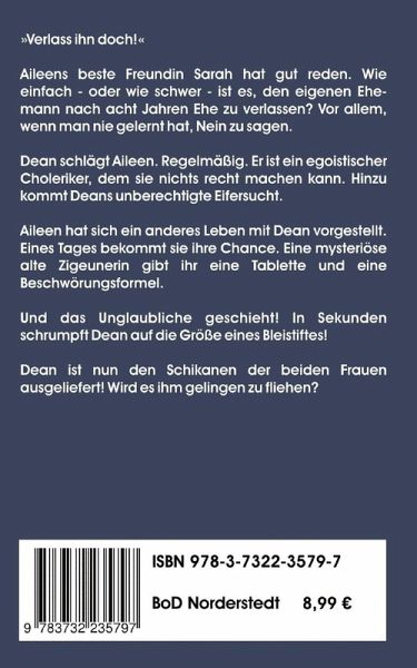 »Verlass ihn doch!«Aileens beste Freundin Sarah hat gut reden. Wie einfach - oder wie schwer - ist es, den eigenen Ehemann nach acht Jahren Ehe zu verlassen? Vor allem, wenn man nie gelernt hat, nein zu sagen.Dean schlägt Aileen. Regelmäßig. Er ist ein egoistischer Choleriker, dem sie nichts recht machen kann. Hinzu kommt Deans unberechtigte Eifersucht.Aileen hat sich ein anderes Leben mit Dean vorgestellt. Eines Tages bekommt sie ihre Chance. Eine mysteriöse alte Zigeunerin gibt ihr eine Tablette und eine Beschwörungsformel. Und das Unglaubliche geschieht! In Sekunden schrumpft Dean auf die Größe eines Bleistiftes!Dean ist nun den Schikanen der beiden Frauen ausgeliefert! Wird es ihm gelingen zu fliehen?
