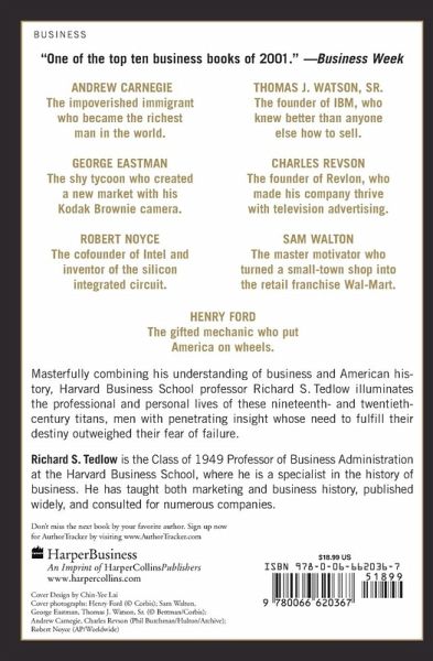 Seven business innovators and the empires they built. The pre-eminent business historian of our time, Richard S. Tedlow, examines seven great CEOs who successfully managed cutting-edge technology and formed enduring corporate empires. With the depth and clarity of a master, Tedlow illuminates the minds, lives and strategies behind the legendary successes of our times: . George Eastman and his invention of the Kodak camera; . Thomas Watson of IBM; . Henry Ford and his automobile; . Charles Revson and his use of television advertising to drive massive sales for Revlon; . Robert N. Noyce, co-inventor of the integrated circuit and founder of Intel; . Andrew Carnegie and his steel empire; . Sam Walton and his unprecedented retail machine, Wal-Mart.