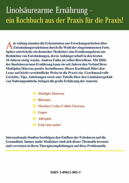 Am Anfang standen die Erkenntnisse aus Forschungsarbeiten über Entzündungsreaktionen durch die Wahl der eingenommenen Fette. Später entwickelte ein deutscher Mediziner eine Ernährungsform zur Reduktion von Entzündungen, deren Anhängerschaft in den letzen 10 Jahren stetig wuchs. Andrea Falke ist selbst Betroffene. Mit Hilfe der linolsäurearmen Ernährung kann sie seit Jahren den Verlauf ihrer Multiplen Sklerose positiv beeinflussen. Dises Kochbuch führt den Leser auf leicht verständliche Weise in die Praxis ein. Geschmackvolle Gerichte, Tips, Anleitungen sowie eine Tabelle über den Linolsäuregehalt von Nahrungsmitteln, belegen die große Erfahrung der Autorin. Multiple Sklerose Rheuma Morbus Chron / Colitis Ulcerosa Lupus Allergien Und vieles mehr! Internationale Studien bestätigen den Einfluss der Fettsäuren auf die Gesundheit. Immer mehr Mediziner sind sich dieser Thematik bewusst und verweisen in ihren Therapieempfehlungen auf diese Problematik.