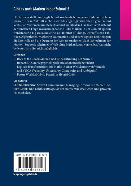 Die Autorin stellt ebenso eindringlich wie anschaulich dar, worauf Marken achten müssen, um in Zukunft nicht in die Gleichgültigkeitsfalle zu geraten und Verlust an Vertrauen und Bedeutsamkeit zu erleiden. Nach Jahrzehnten der Marken-Euphorie scheint eine Welt ohne Marken kaum vorstellbar. Was nicht bedeutet, dass dies nicht möglich ist. Das Buch beantwortet die Frage, ob es noch Marken in der Zukunft geben wird, wenn Big Data, Industrie 4.0, Internet of Things, Ultraeffizienzfabriken, Algorithmen und künftige digitale Technologien regieren und die Deutung der Welt übernehmen.