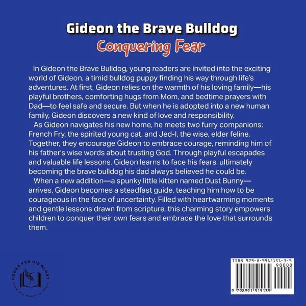 In Gideon the Brave Bulldog, young readers are invited into the exciting world of Gideon, a timid bulldog puppy finding his way through life's adventures. At first, Gideon relies on the warmth of his loving family-his playful brothers, comforting hugs from Mom, and bedtime prayers with Dad-to feel safe and secure. But when he is adopted into a new human family, Gideon discovers a new kind of love and responsibility. As Gideon navigates his new home, he meets two furry companions: French Fry, the spirited young cat, and Jed-I, the wise, elder feline. Together, they encourage Gideon to embrace courage, reminding him of his father's wise words about trusting God. Through playful escapades and valuable life lessons, Gideon learns to face his fears, ultimately becoming the brave bulldog his dad always believed he could be. When a new addition-a spunky little kitten named Dust Bunny-arrives, Gideon becomes a steadfast guide, teaching him how to be courageous in the face of uncertainty. Filled with heartwarming moments and gentle lessons drawn from scripture, this charming story empowers children to conquer their own fears and embrace the love that surrounds them.