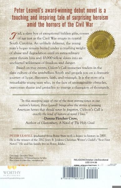Author Peter Leavell forges an unprecedented tale of tragedy and triumph amid the backdrop of the Civil War through the story of Tad, a very clever slave boy who comes of age as America's war reaches the sea islands of South Carolina. Tad's desire to better himself is obstructed by the color of his skin, until Northern soldiers force the evacuation of white plantation owners, setting 10,000 slaves free in a single day. These circumstances seem like a dream, except that the newly freed slaves have no money, no education, and little hope for the future-unless someone rises up to lead them. Based on true events, Gideon's Call is the dramatic tale of a young man who battles the shame of his past and faces the horrors of war and unimaginable prejudice to become the deliverer of thousands of freed slaves