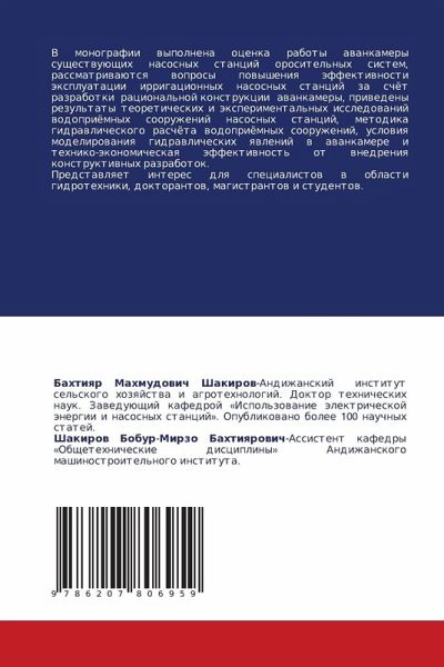V monografii wypolnena ocenka raboty awankamery suschestwuüschih nasosnyh stancij orositel'nyh sistem, rassmatriwaütsq woprosy powysheniq äffektiwnosti äxpluatacii irrigacionnyh nasosnyh stancij za schöt razrabotki racional'noj konstrukcii awankamery, priwedeny rezul'taty teoreticheskih i äxperimental'nyh issledowanij wodopriömnyh sooruzhenij nasosnyh stancij, metodika gidrawlicheskogo raschöta wodopriömnyh sooruzhenij, uslowiq modelirowaniq gidrawlicheskih qwlenij w awankamere i tehniko-äkonomicheskaq äffektiwnost' ot wnedreniq konstruktiwnyh razrabotok. Predstawlqet interes dlq specialistow w oblasti gidrotehniki, doktorantow, magistrantow i studentow.