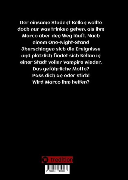 Der einsame Student Kellan wollte doch nur was trinken gehen, als ihm Marco über den Weg läuft. Nach einem One-Night-Stand überschlagen sich die Ereignisse und plötzlich findet sich Kellan in einer Stadt voller Vampire wieder.Das gefährliche Motto?Pass dich an oder stirb!Wird Marco ihm helfen?