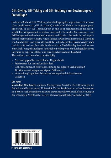 In diesem Buch wird die Wirkung eines bedingungslos angebotenen Geschenks (Geschenkaustausch, Gift-Exchange) sowie einer kleinen vorangegangenen Bitte (Fuß-in-der-Tür-Technik, Foot-in-the-door-technique) auf die Bereitschaft, Freiwilligenarbeit zu leisten, untersucht.Es werden Mechanismen und Erklärungsansätze des Geschenkaustauschs diskutiert, theoretische und experimental-methodische Ansätze vorgeschlagen sowie der Einsatz und die Wirkung von Geschenken und einer kleinen Bitte im Feld erprobt. Hierzu werden stark rezipierte formal-mathematische theoretische Modelle adaptiert und weiterentwickelt, ein großangelegtes natürliches Feldexperiment durchgeführt sowie Literatur zu experimenteller und theoretischer Evidenz diskutiert.Thematisiert werden schwerpunktmäßig-Aversion gegenüber vorteilhafter Ungleichheit-Präferenzen für reziprokes Erwidern-Wahrgenommene Selbstwahrnehmung des eigenen Verhaltens mit direkten Auswirkungen auf eigenePräferenzen-Vermeidung kognitiver Dissonanz bedingt durch inkonsistentes Verhalten