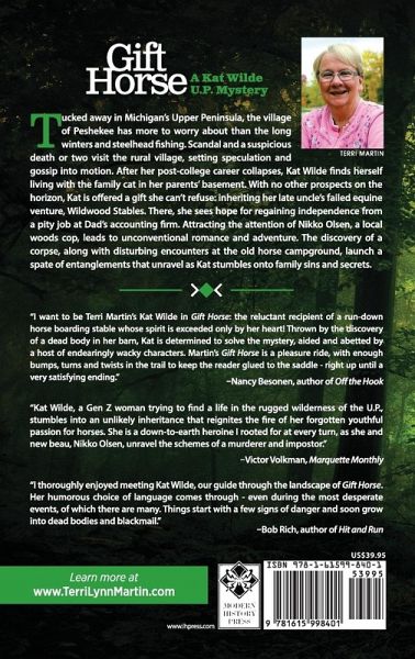 Tucked away in Michigan's Upper Peninsula, the village of Peshekee has more to worry about than the long winters and steelhead fishing. Scandal and a suspicious death or two visit the rural village, setting speculation and gossip into motion. After her post-college career collapses, Kat Wilde finds herself living with the family cat in her parents' basement. With no other prospects on the horizon, Kat is offered a gift she can't refuse: inheriting her late uncle's failed equine venture, Wildwood Stables. There, she sees hope for regaining independence from a pity job at Dad's accounting firm. Attracting the attention of Nikko Olsen, a local woods cop, leads to unconventional romance and adventure. The discovery of a corpse, along with disturbing encounters at the old horse campground, launches a spate of entanglements that unravel as Kat stumbles onto family sins and secrets. "I want to be Terri Martin's Kat Wilde in Gift Horse: the reluctant recipient of a run-down horse boarding stable whose spirit is exceeded only by her heart! Thrown by the discovery of a dead body in her barn, Kat is determined to solve the mystery, aided and abetted by a host of endearingly wacky characters. Martin's Gift Horse is a pleasure ride, with enough bumps, turns and twists in the trail to keep the reader glued to the saddle -- right up until a very satisfying ending." -- Nancy Besonen, author of Off the Hook" Kat Wilde, a Gen Z woman trying to find a life in the rugged wilderness of the U.P., stumbles into an unlikely inheritance that reignites the fire of her forgotten youthful passion for horses. She is a down-to-earth heroine I rooted for at every turn, as she and new beau, Nikko Olsen, unravel the schemes of a murderer and impostor." -- Victor Volkman, Marquette Monthly "Kat is a delightful character with a fine sense of humor and the minor characters are not merely cardboard cutouts. The U.P. is also a nicely drawn character that contributes to the pleasure of reading what I hope is the first of A Kat Wilde U.P. Mystery series." -- Tom Powers, Michigan in Books "I thoroughly enjoyed meeting Kat Wilde, our guide through the landscape of Gift Horse. Her humorous choice of language comes through - even during the most desperate events, of which there are many. Things start with a few signs of danger and soon grow into dead bodies and blackmail." -- Bob Rich, author of Hit and Run "Gift Horse is a first-class mystery story using engaging characters. The story flows masterfully with Martin's signature undertone of humor. She uses it well. Things start to move fast after Kat Wildeinherits her uncle's failed equine venture, Wildwood Stables Twists and turns occur and romance develops when Kat pairs up with Niko, the handsome son of the local sheriff. Unexplained murders and family secrets run in tandem to Kat and Niko's growing romance. I loved this book and can't wait to read more of Kat's adventures." -- Ann Dallman, award-winning author of Cady Whirlwind Thunder Mysteries Learn more at www.TerriLynnMartin.com From Modern History Press