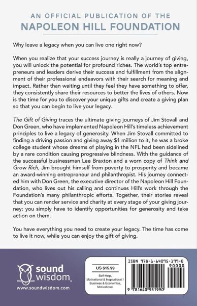 Why leave a legacy when you can live one right now? When you realize that your success journey is really a journey of giving, you will unlock the potential for profound riches. The world's top entrepreneurs and leaders derive their success and fulfillment from the alignment of their professional endeavors with their search for meaning and impact. Rather than waiting until they feel they have something to offer, they consistently share their resources to better the lives of others. Now is the time for you to discover your unique gifts and create a giving plan so that you can begin to live your legacy. The Gift of Giving traces the ultimate giving journeys of Jim Stovall and Don Green, who have implemented Napoleon Hill's timeless achievement principles to live a legacy of generosity. When Jim Stovall committed to finding a driving passion and giving away $1 million to it, he was a broke college student whose dreams of playing in the NFL had been sidelined by a rare condition causing progressive blindness. With the guidance of the successful businessman Lee Braxton and a worn copy of Think and Grow Rich, Jim brought himself from poverty to prosperity and became an award-winning entrepreneur and philanthropist. His journey connected him with Don Green, the executive director of the Napoleon Hill Foundation, who lives out his calling and continues Hill's work through the Foundation's many philanthropic efforts. Together, their stories reveal that you can render service and charity at every stage of your giving journey; you simply have to identify opportunities for generosity and take action on them. You have everything you need to create your legacy. The time has come to live it now, while you can enjoy the gift of giving.
